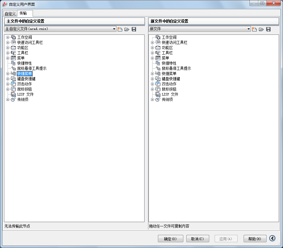 注意除在“快捷特性”和“鼠标悬停工具提示”节点下定义的特性设置外,所有元素均可在两个 CUIx 文件之间进行传输。