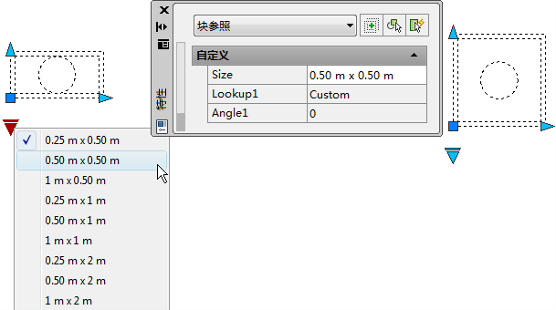 用户可以使用包含查寻夹点的块参照来指定可更改块参照显示方式的预设值。新的大小显示在特性选项板中的“自定义”下。