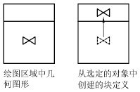 图例中的块定义包含块名、PLUG_VALVE、四条直线和位于两条对角线相交处的基点。有关显示的示范演示文稿的说明,请参见块概述。