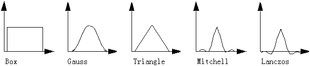 有五种过滤器方法:Box、Gauss、Triangle、Mitchell 和 Lanczos。默认的方法为 Box,这也是最快的方法。Mitchell 通常是最精确的方法。Box 过滤器均匀地结合样例,但不对其进行加权。其他每种过滤器在结合样例前都使用特定的曲线对样例进行加权。
