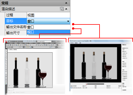 渲染目标在“渲染描述”部分的“高级渲染设置”选项板中设定。默认的设置为“窗口”。