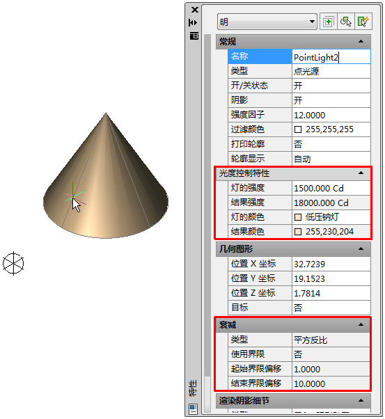将 LIGHTINGUNITS 系统变量设定为 1(美制单位)或 2(国际 SI 单位)以使用光度控制光源时,其他特性可用于点光源。在“特性”选项板上,光度控制特性为